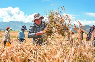 西藏拉萨市林周县松盘乡岗巴村农民在收割青稞。新华社发