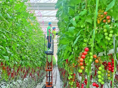新疆可克达拉市一家农业科技公司内,两位工作人员正在修剪串收番茄枝蔓。新华社发